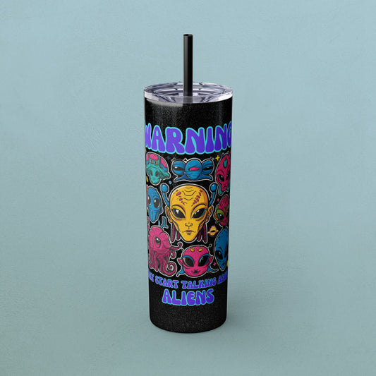 Warning May Start Talking About Aliens, Skinny Tumbler with Straw, 20oz