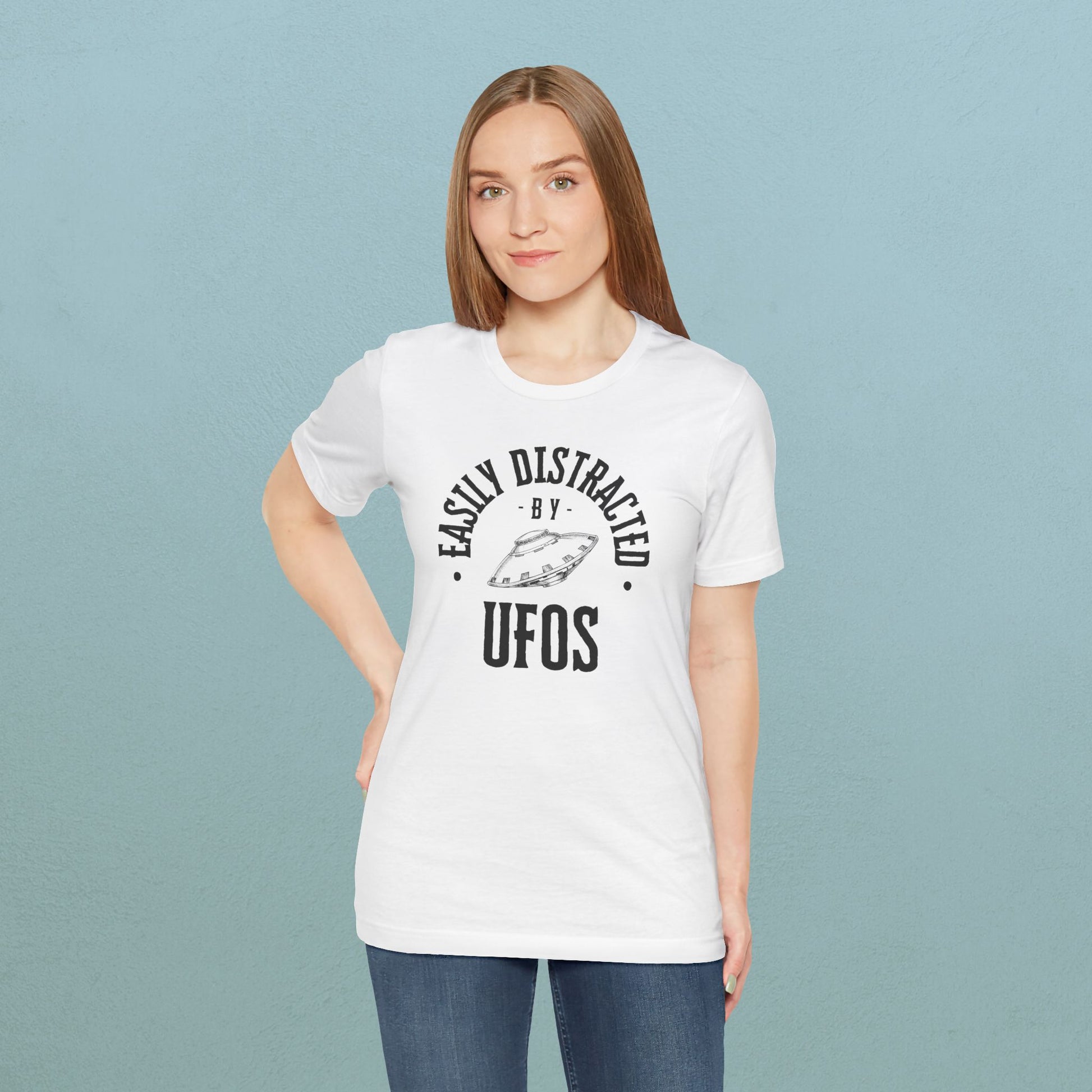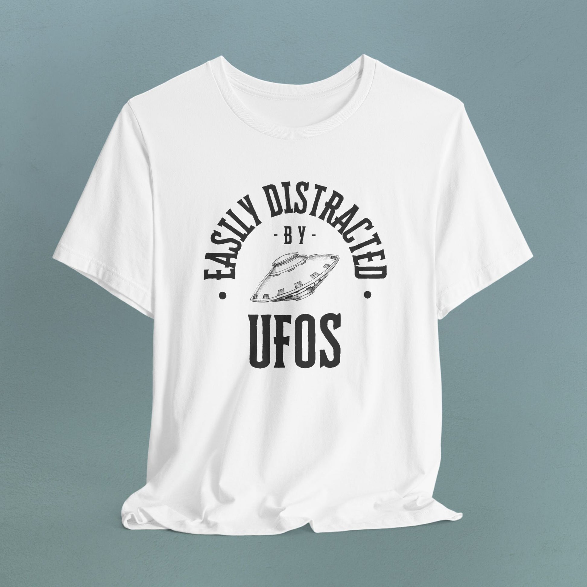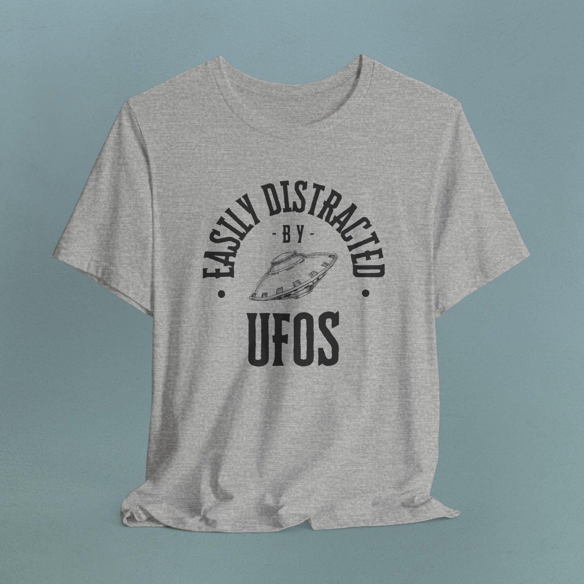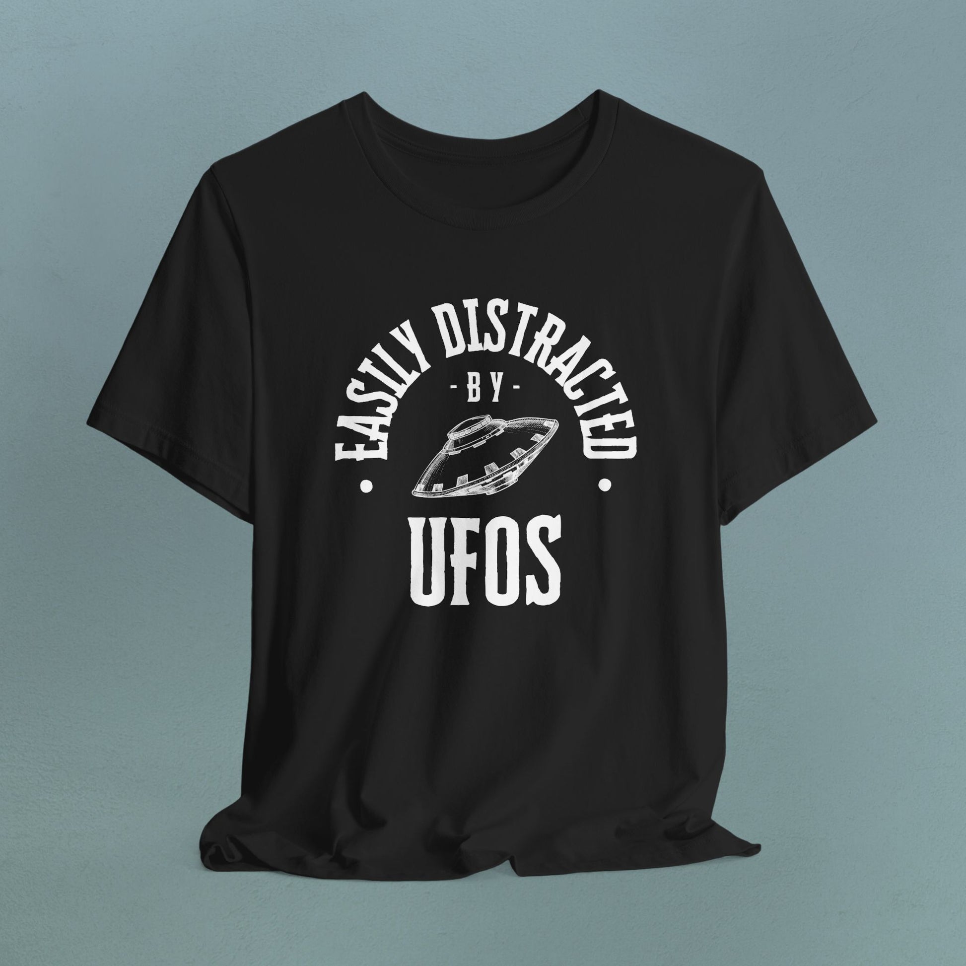 Easily distracted by UFOs, clean one color text on plain background. Comfy, tee with alien spaceship design for all UFO hunters.